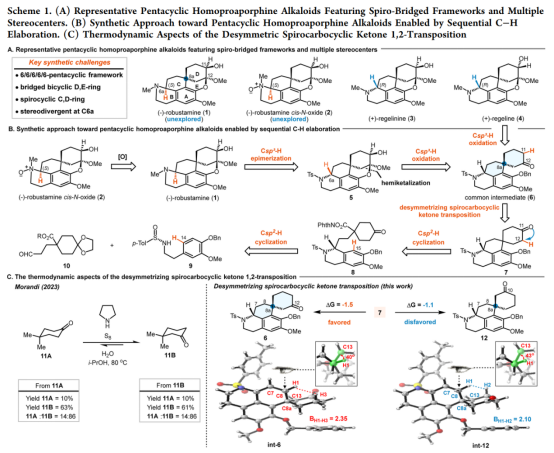 具有螺环-桥环骨架和多个立体中心的四氢异喹啉生物碱(如吗啡和曲贝替定743)展现出显著的结构多样性与广泛生物活性,一直是天然产物合成化热点和前沿领域之一。在生物活性方面,含有螺环-桥环的多环活性天然产物以独特三维空间结构,通过增强分子构象刚性和结合特异性,显著影响其生物活性。其中,五环高原阿朴啡碱是一类主要从秋水仙科植物中分离的四氢异喹啉类天然产物。结构上,该类分子具有独特的6/6/6/6/6五元并环体系,包括螺环-桥环骨架及多位点立体化学差异,使得其立体多样性合成极具挑战。