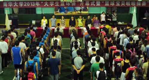 夜幕落下,点点星光撒在羽毛球馆中,仿佛给羽毛球馆披上了一件薄薄的轻纱似的。伴随着一曲铿锵有力的国歌奏响,开幕式正式开始。本次开幕式共分为七项。第一项:由主持人赵红老师介绍到场的嘉宾;第二项:由校长文格波老师为开幕式致辞,幷提出对学校各学院运动员的希冀,希望他们能赛出风采,赛出友谊;第三项:由化学化工学院运动员代表宣誓;第四项:由裁判员代表宣誓;第五项:由医学院和船山学院共同带来啦啦操表演,舞龙舞狮表演;第六项:由校长文格波老师宣布2013年校级篮球比赛正式开始;第七项:由南华大学校篮球队与南华大学校领导组成的队伍经行第一场角逐,紧接着由电气工程学院与医学院的同学经行第二场对决。